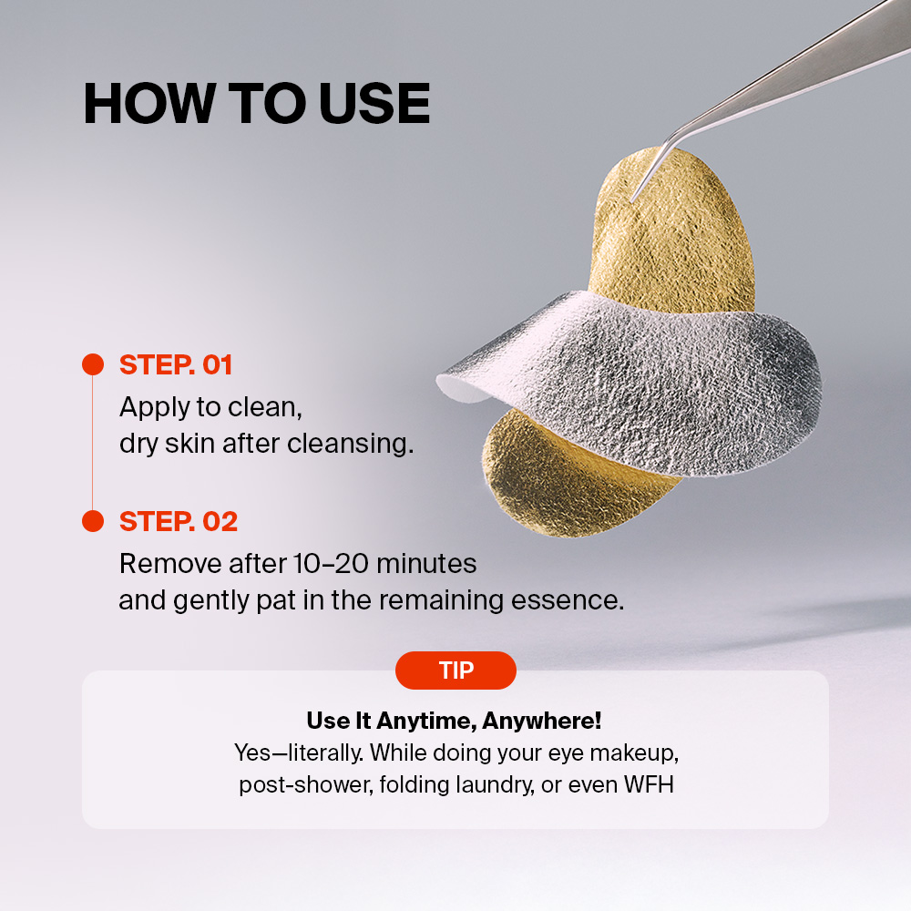 1. After cleansing, apply mask onto dry skin under the eyes (or other concern areas).