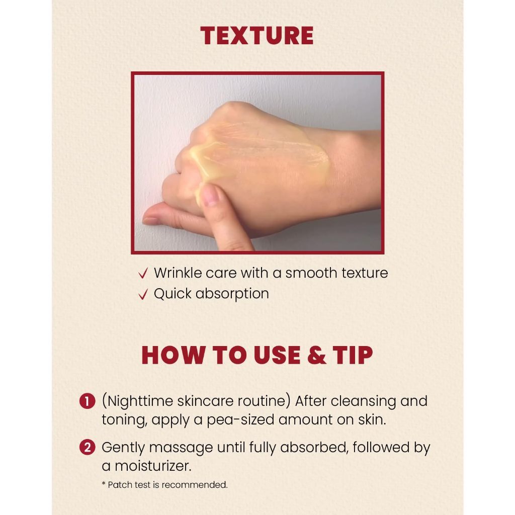 Purified Water, Glycerin, Dipropylene Glycol, Caprylic/Capric Triglyceride, 1,2-Hexanediol, Niacinamide, Butylene Glycol, Methyl Glucose-20, Polyglyceryl-3 Methylglucose Distearate, Black Ginseng Extract, Hydrogenated Lecithin, Sorbitan Stearate, Ammonium Acryloyldimethyltaurate/VP Copolymer, Macadamia Seed Oil, Carbomer, Tromethamine, Betaine, Tocopherol (Vitamin E), Ethylhexylglycerin, Sunflower Seed Oil, Adenosine, Disodium EDTA, Cholesterol, Polyglyceryl-10 Oleate, Canola Sterol, Phytosteryl/Behenyl/Octyldodecyl Lauroyl Glutamate, Retinal, Silica, Aluminum/Magnesium Hydroxide Stearate, Potassium Cetyl Phosphate, Pentaerythrityl Tetra-di-t-butyl Hydroxyhydrocinnamate, Burdock Root Extract, Cnidium Officinale Root Extract, Dioscorea Japonica Root Extract, Peony Root Extract, Rehmannia Root Extract, 3-O-Ethyl Ascorbic Acid, Bakuchiol, sh-Oligopeptide-1, sh-Oligopeptide-2, sh-Polypeptide-1
