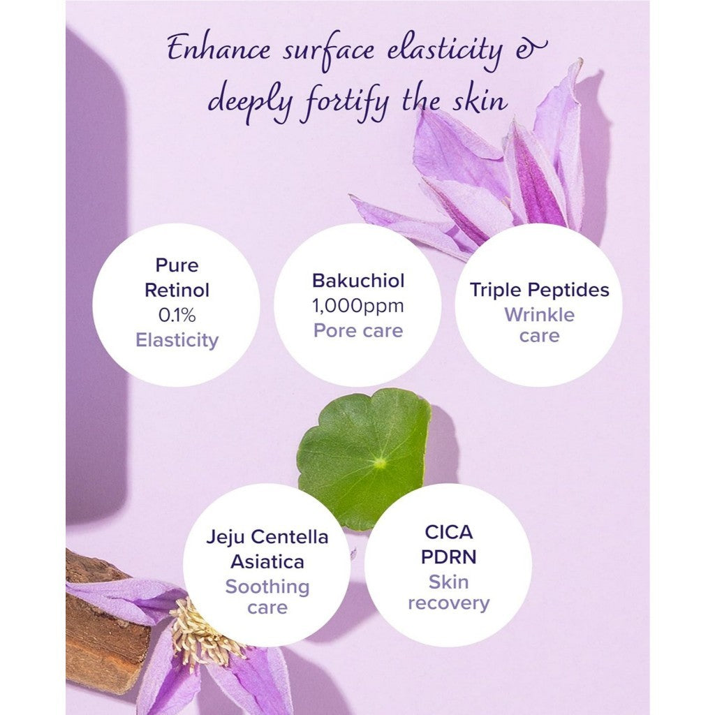 POWERFUL INGREDIENTS FOR EFFECTIVE RESULTS: Formulated with 0.1% retinol, 1,000 ppm of bakuchiol, Jeju Centella Asiatica extract (Cica PDRN), and triple peptides, this serum helps regenerate skin, tighten pores, and improve elasticity. The result is a youthful, firm complexion with fewer fine lines and enhanced skin smoothness.