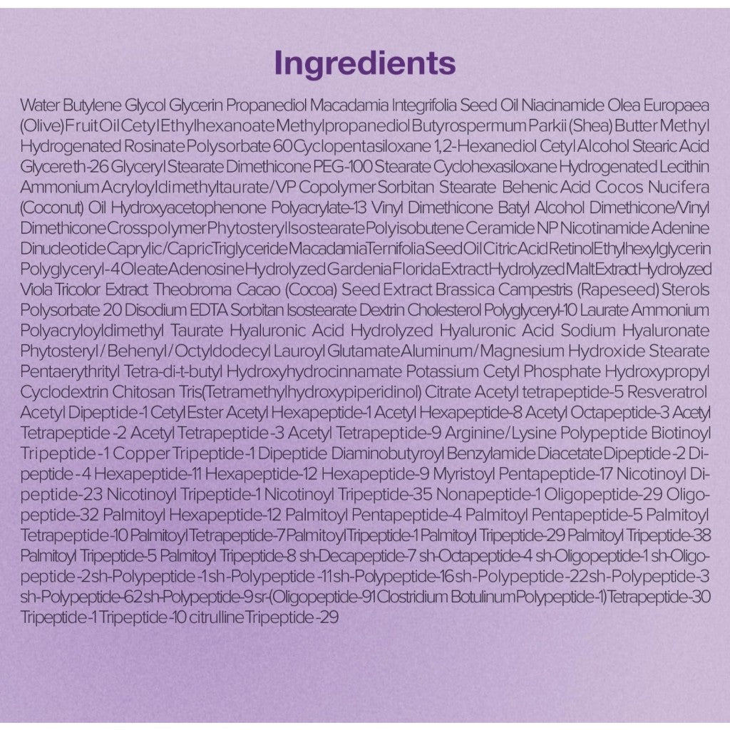 [KEY INGREDIENTS] Formulated with NAD+, a powerful anti-aging ingredient that supports collagen production and skin repair, along with 50 types of peptides to plump and firm the skin. Retinol smooths skin and reduces the look of wrinkles, while ceramide nourishes and strengthens the delicate eye area. Niacinamide brightens dark circles and rejuvenate the entire eye area restoring vitality and radiance.