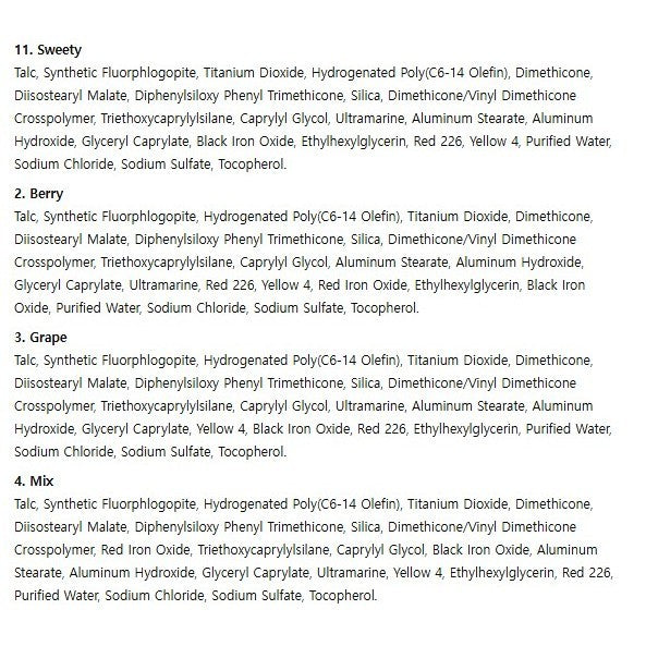 Lavender: Talc, Synthetic Fluorphlogopite, Titanium Dioxide, Hydrogenated Poly(C6-14 Olefin), Dimethicone, Diisostearyl Malate, Diphenylsiloxy Phenyl Trimethicone, Silica, Dimethicone/Vinyl Dimethicone Crosspolymer, Triethoxycaprylylsilane, Ultramarine, Caprylyl Glycol, Aluminum Myristate, Aluminum Hydroxide, Glyceryl Caprylate, Ethylhexylglycerin, Red 226, Yellow 4, Purified Water, Sodium Chloride, Sodium Sulfate, Tocopherol