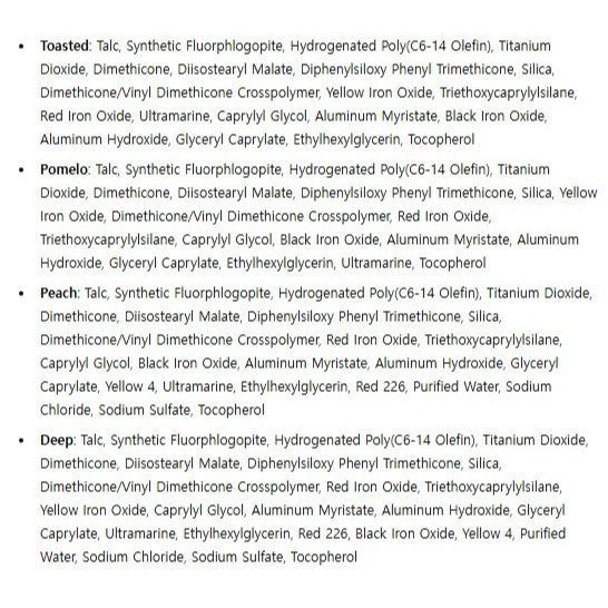 Pink: Talc, Synthetic Fluorphlogopite, Titanium Dioxide, Hydrogenated Poly(C6-14 Olefin), Dimethicone, Diisostearyl Malate, Diphenylsiloxy Phenyl Trimethicone, Silica, Dimethicone/Vinyl Dimethicone Crosspolymer, Triethoxycaprylylsilane, Caprylyl Glycol, Aluminum Myristate, Aluminum Hydroxide, Glyceryl Caprylate, Red 226, Ethylhexylglycerin, Ultramarine, Yellow 4, Purified Water, Sodium Chloride, Sodium Sulfate, Tocopherol