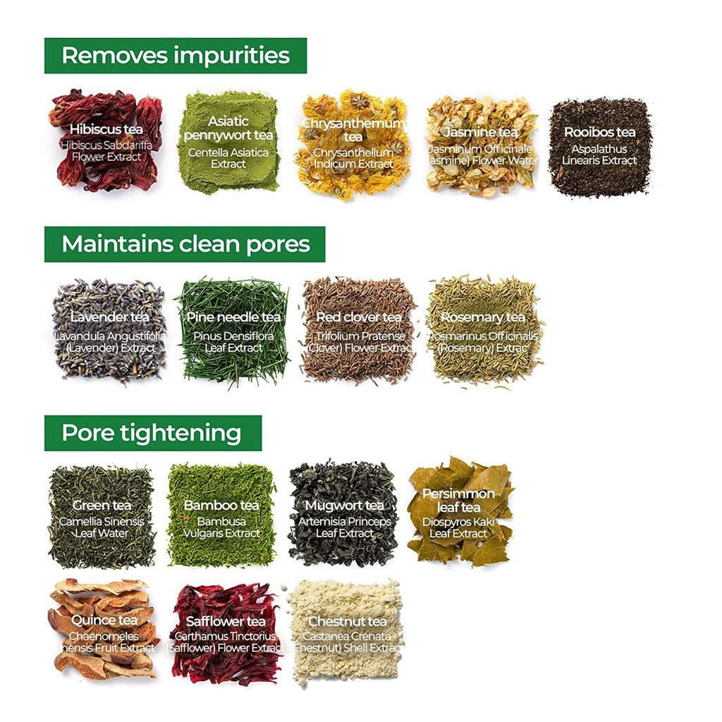 - KEY INGREDIENTS : Green tea water can provide anti-aging benefits and soothe the skin. Additionally, centella, bamboo tea, pine needles, raw green tea leaf, and konjac grains can reduce skin irritations and troubles, exfoliate gently, and provide additional benefits to leave the skin feeling refreshed and rejuvenated