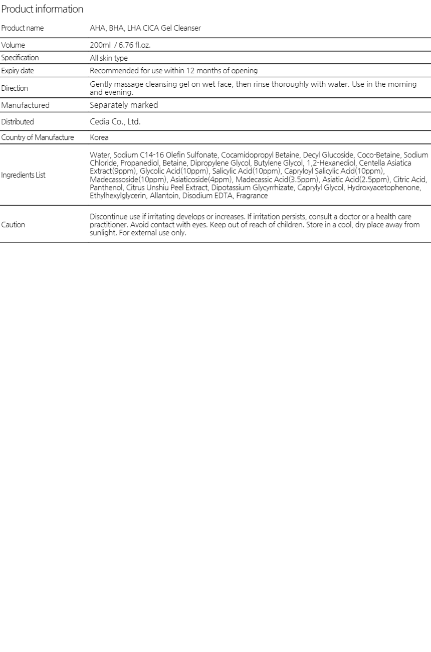 Cedia AHA BHA CICA Gel cleanser 200ml