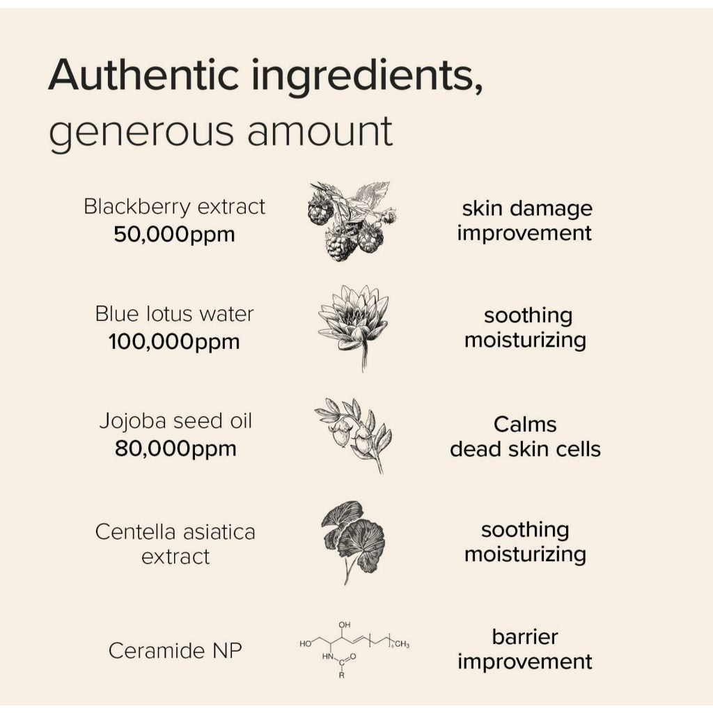 - 100,000ppm Blue lotus water: The blue lotus is called the flower of life in ancient Egypt. Its excellent moisturizing and soothing effect makes the skin moist and elastic.