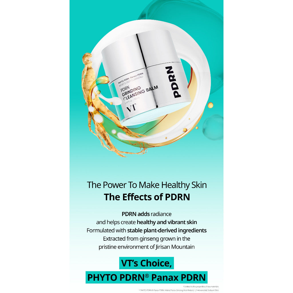 [Glory exclusive] VT PDRN Grinding Cleansing Balm, 50mL ✨ Deep hydration & skin-firming care with PHYO PDRN® Panax Experience a new level of cleansing with VT's PHYO PDRN® Panax, a plant-derived low-molecular-weight PDRN that deeply penetrates the skin. Unlike animal-based PDRN, it delivers moisture from within, helping to keep skin firm and healthy. 🧖‍♀️ Melts instantly with a soft touch Just apply and feel it melt into your skin. This sherbet-like balm gently dissolves heavy makeup, waterproof mascara, and impurities inside pores, leaving your skin feeling fresh and moisturized after washing. 💧 3-Step Deep Cleansing Formula Balm: Soft sherbet texture that melts smoothly on your skin. Milk: Transforms with water into a milky texture for deep cleansing. Oil: Goes deep into pores to remove impurities thoroughly. ✔ Recommended for: - Those who want quick makeup removal with minimal irritation. - Those looking for a moisturizing finish without tightness after cleansing. - Those who want a gentle yet thorough deep pore cleanse. ✅ Key Benefits Quickly dissolves makeup and old keratin. Deep cleanses inside pores while maintaining moisture. Leaves skin feeling soft, hydrated, and refreshed. How to Use 1. Turn the dial in the direction of the arrow to dispense an appropriate amount of balm. 2. Apply gently to your dry face and massage in circular motions. 3. Wet your hands with a little water and continue massaging for about 30 seconds. 4. Rinse off thoroughly with lukewarm water.