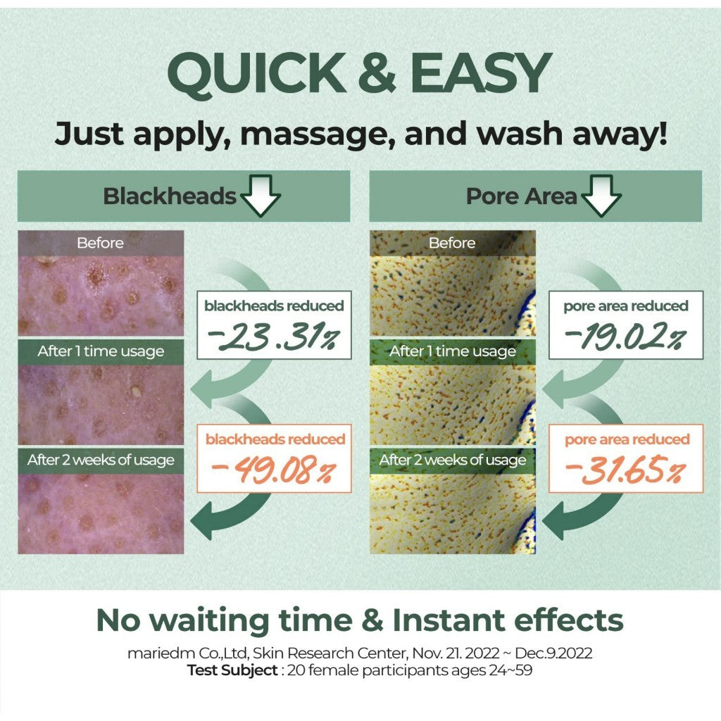 Green tea powder from Boseong-Hadong Green Tea, green tea seed oil, green tea water, and charcoal powder from Damyang Charcoal Green clay (made in France) help remove impurities and manage pores.