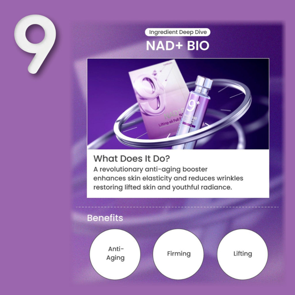 - No.9 NAD Bio Lifting Essence: Supports elasticity, firmness, and skin vitality