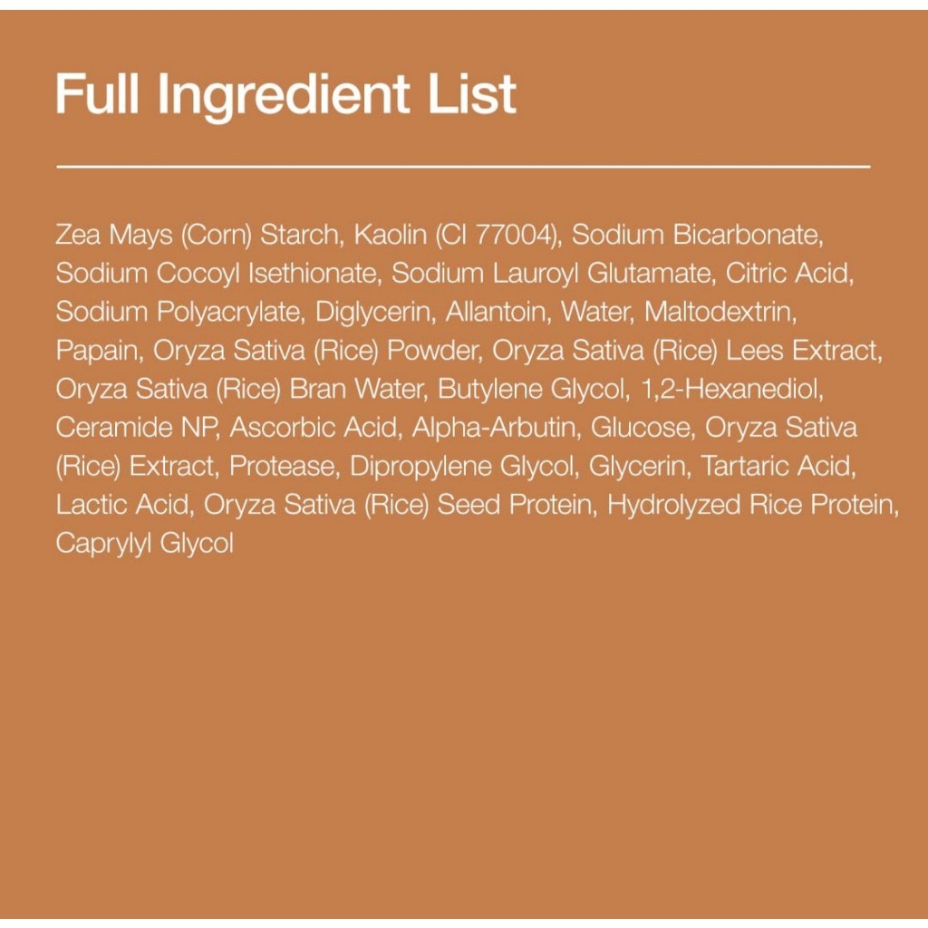Zea Mays (Corn) Starch, Kaolin, Sodium Bicarbonate, Sodium Cocoyl Isethionate, Sodium Lauroyl Glutamate, Citric Acid, Sodium Polyacrylate, Diglycerin, Allantoin, Purified Water, Maltodextrin, Papain, Oryza Sativa (Rice) Powder (1,000 ppm), Oryza Sativa (Rice Bran) Extract (1,000 ppm), Oryza Sativa (Rice Germ) Extract (487.5 ppm), Butylene Glycol, 1,2-Hexanediol, Ceramide NP, Ascorbic Acid, Arginine, Allantoin, Gluconolactone, Oryza Sativa (Rice) Extract (7,500 ppm), Propanediol, Dipropylene Glycol, Glycerin, Tartaric Acid, Lactobacillus Ferment, Oryza Sativa (Rice) Bran Wax (150 ppb), Hydrolyzed Rice Bran Extract (150 ppb), Caprylyl Glycol.