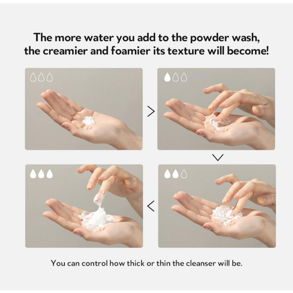 [EASY APPLICATION] Wet your hands and take about half a teaspoon of the powder. Create a light, creamy foam then gently massage in circular motions, avoiding the eye area. Rinse thoroughly with water. Enjoy the refreshing transformation of your skin!