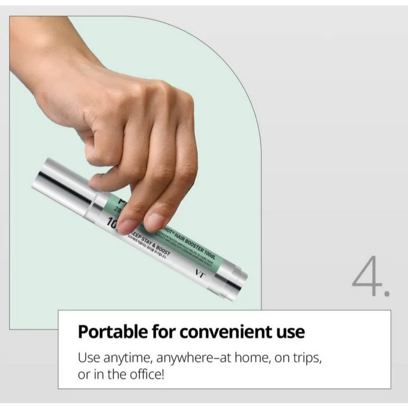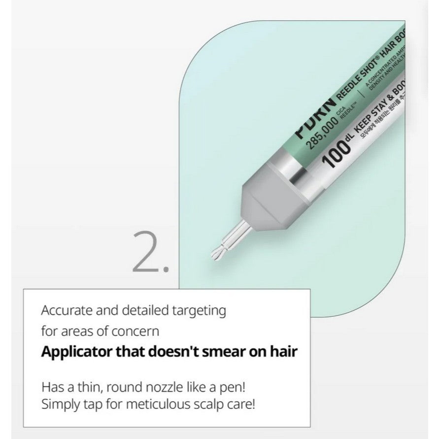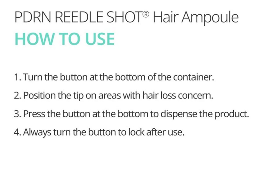 VT Cosmetics PDRN Reedle Shot Hair Ampoule, 15mL 3 Types (100dL / 300dL / 700dL) Description - Hair Maintenance Reduces hair loss and improves overall hair condition Tightens scalp pores for improved firmness and elasticity Enhances scalp blood circulation and scalp density Improves elasticity across five scalp layers - Hair Soothing Provides temporary soothing effects on the scalp from infrared (heat) exposure Reduces scalp temperature temporarily in warm environments Improves scalp moisture retention and reduces sebum production Offers temporary soothing effects after external irritation exposure - Benefits : This concentrated hair ampoule with Reedle Shot helps improve hair density for healthy-looking hair and scalp. Enriched with 9GF and Caffeine to promote hair growth. Infused with plant-based PDRN to deeply nourish and awaken vitality for a healthy scalp. Contains Sophora Flavescens Extract and Houttuynia Extract to soothe and care for the problematic scalp. - How to use: 1. Turn the button at the bottom of the container. 2. Position the tip on areas with hair loss concerns. 3. Press the button at the bottom to dispense the product. 4. Always turn the button to lock after use.